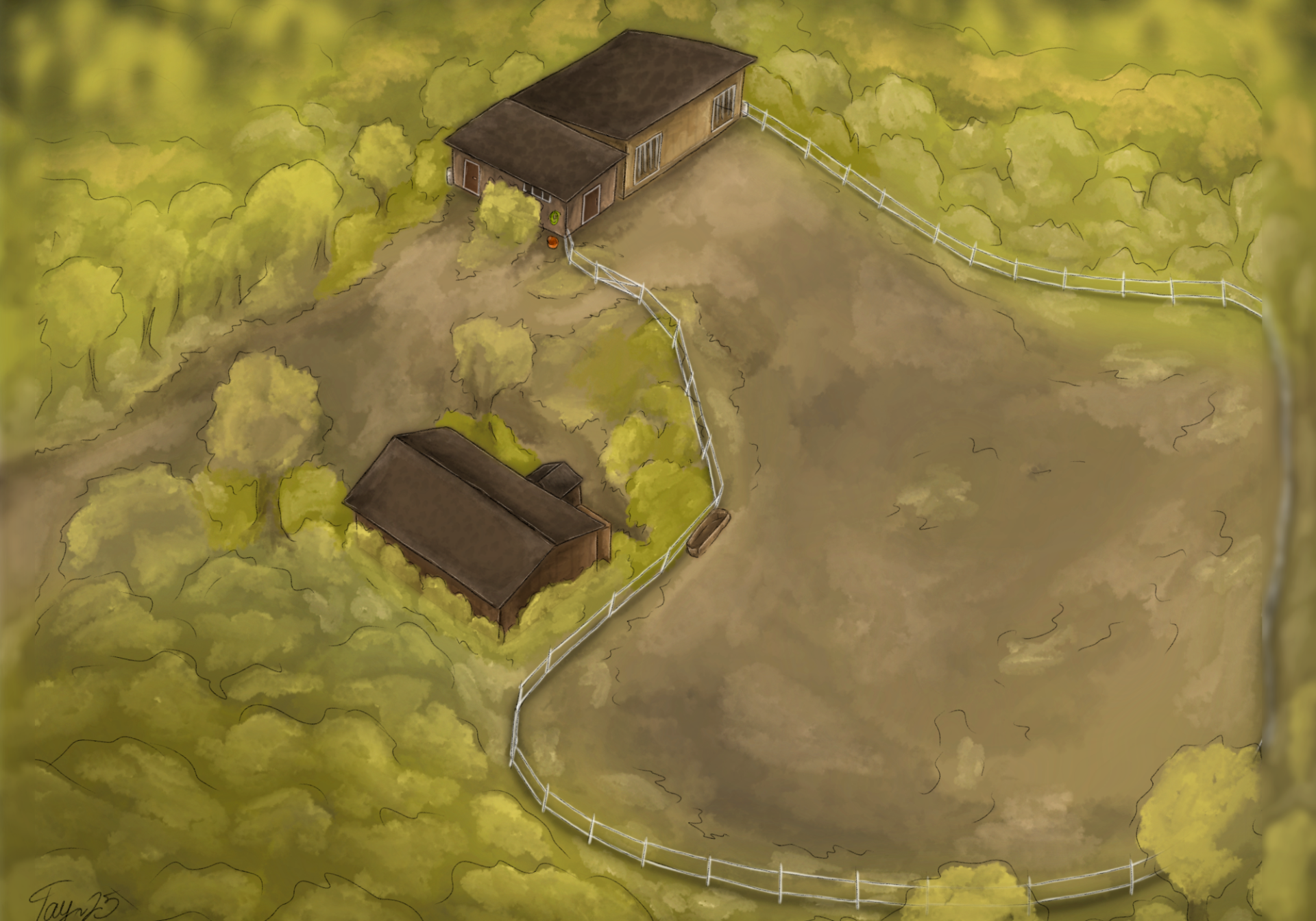 Tallin piha on suurimmaksi osaksi ylikasvanutta risukkoa ja pitkää nurmea. Tallille vie peltojen ja metsän läpi huonokuntoinen hiekkatie. Hevosaitaus on sähkötön valkea puuaita.